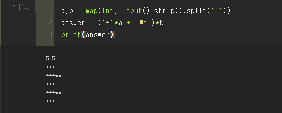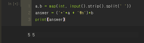 예를 들어, input에 '5 (space bar) 3' 을 입력하면 ' * ' 별 모양이 가로 5와 세로 3으로 그려지는 것입니다.