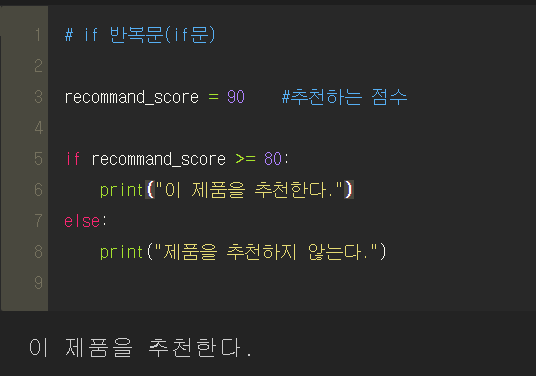 지금 추천 점수는 90점 이므로, if문의 실행 부분이 작동하여 '이 제품을 추천한다.'가 print 된 것을 확인할 수 있습니다. 그렇다면 만약 80점 미만이면 어떻게 작동할까요? 당연히 밑의 그림처럼 else 문이 실행됩니다.