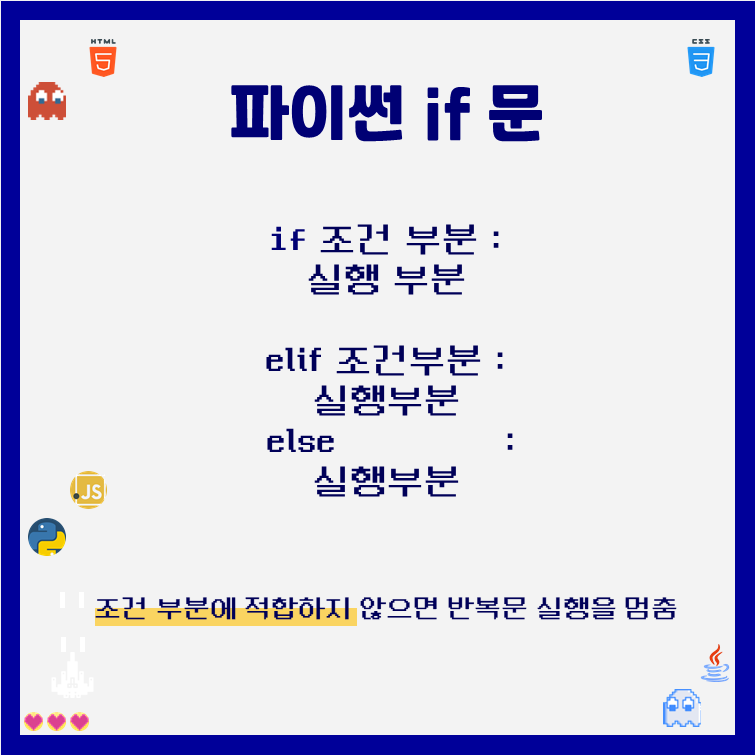 우선 if / elif / else 이렇게 구성되긴 하지만, 저는 if + else 문을 먼저 보고 ! 그 이후 elif 문을 보는 것으로 진행해보겠습니다. (어차피 조건이 추가되면 그 부분을 추가해주면 되는 것이라서 간단하게 볼 수 있습니다! )