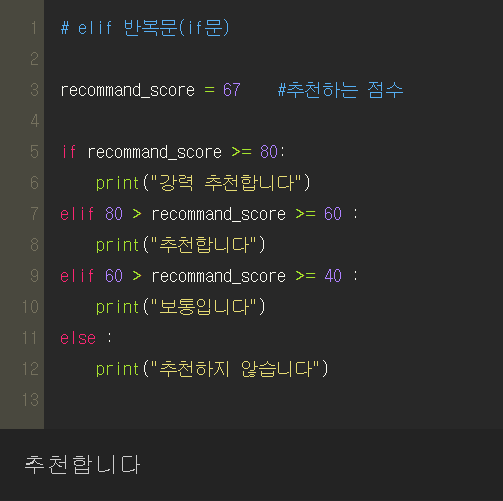 if문을 계속해서 써야할까요? 아닙니다! 이럴 경우 쓰는 것이 elif문입니다. else + if로 이해하시면 이해하기 편할 것 같습니다. 그렇다면 추천 점수를 기준으로