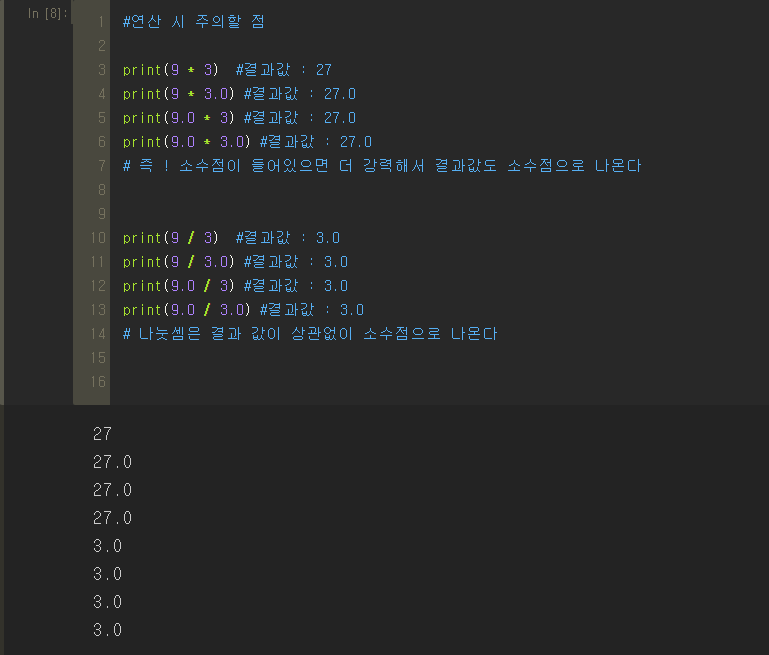 요약 : 정수(integer) 가 실수(float : 예를들어 소수와 같은)와 연산하는 경우!!!!! 실수(float) 값이 힘이 더 세서 결과값이 실수(float)가 나온다를 주의하셔야 합니다 !!