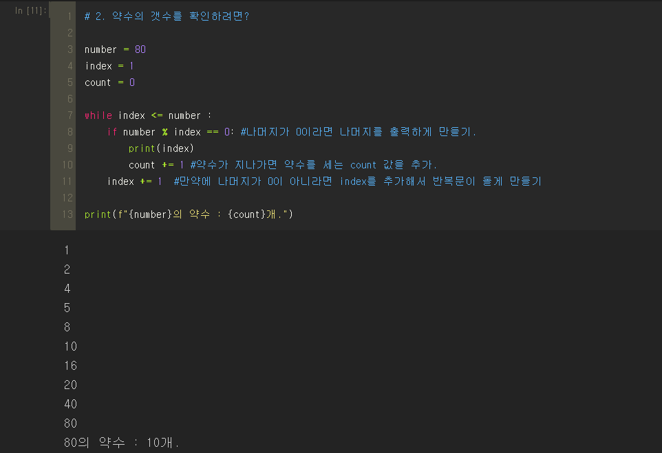 위의 조건에서 약수의 갯수를 세어주고 또 그 값을 추가해서 반복문 조건을 추가해주어야 합니다. 그러기 위해서는, 이제 빈 공간을 하나 만들어 주어야하는데요, 약수를 하나씩 저장해주는 것이 아니라 변수 하나를 지정해주고 약수가 나왔을 때 하나씩 올려가는 방법으로 진행하고자 했습니다.