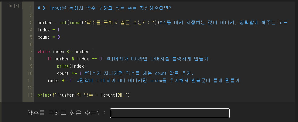 이번엔 우리가 앞서 지정한 조건들에 더해서 input을 통해서 미리 지정하는 것이 아닌, 입력받아서 그 입력 값의 약수를 구하는 코드를 추가해보겠습니다. 추가로 사용되는 코드 문법은 파이썬 input 입니다.
